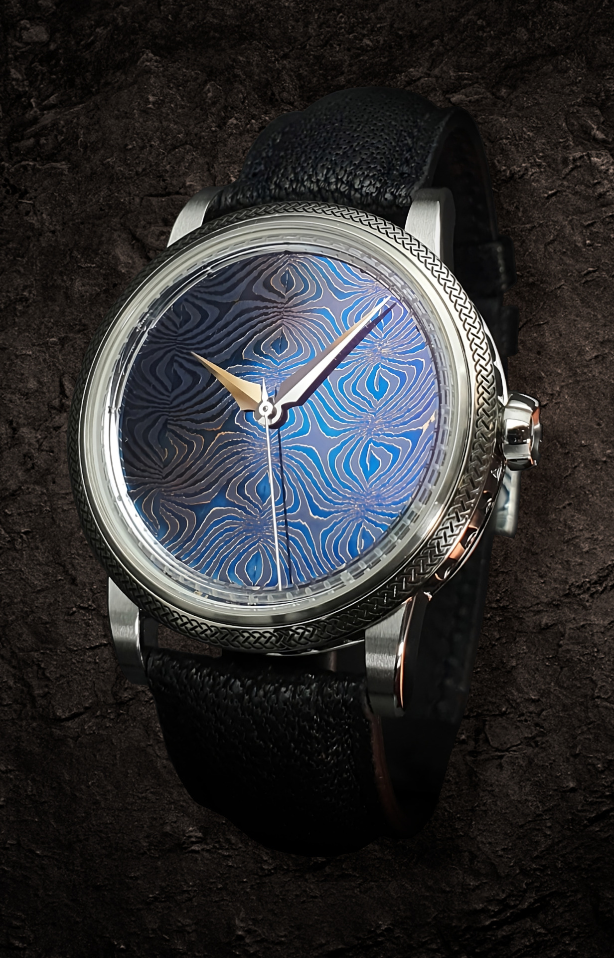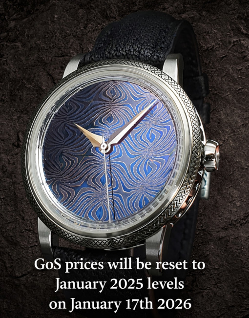 GoS is widely recognized as the brand that introduced pattern-welded steel—commonly known as Damascus steel—into high-end watchmaking. Since the first deliveries in spring 2008, both design and craftsmanship have undergone continuous evolution. In 2019, bladesmith Conny Persson joined as the GoS bladesmith, and together with Patrik Sjögren, they elevated the artistry even further with the Fullerö Sword. The model pays tribute to the skills of Viking-age bladesmiths by recreating the intricate sword-blade patterns in a watch dial.
